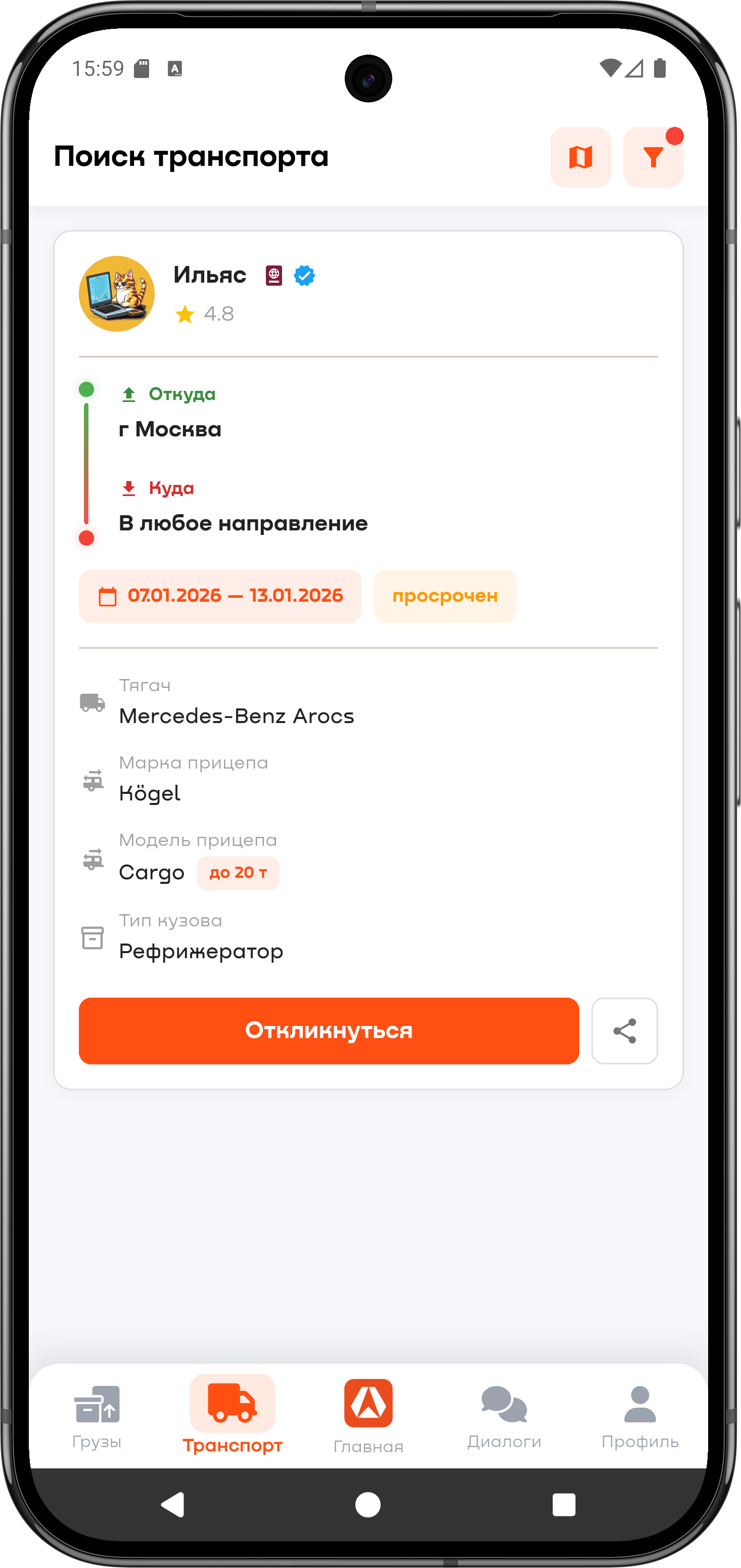 Откликайтесь на груз, принимайте условия или предлагайте свою цену прямо в приложении.